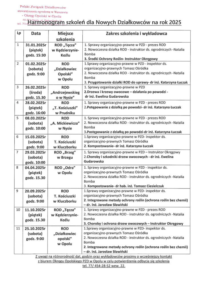 Harmonogram szkoleń dla Nowych Działkowców na 2025